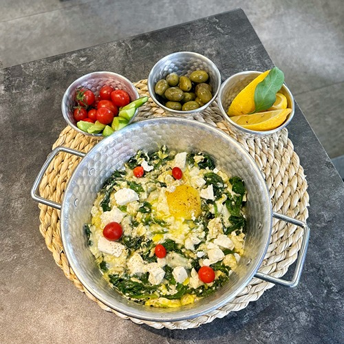 تخم مرغ، پياز، پنير موزارلا، نان، دورچين خيار، گوجه و زيتون
