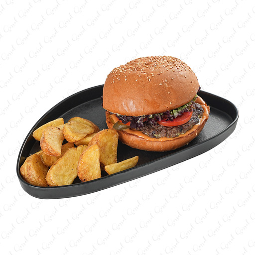 ترکيبات: 150 گرم گوشت برگر دست ساز، کاهو، گوجه ، خيارشور، سس گوشت و سبزيجات، سيب زميني