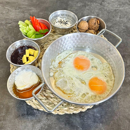 نيمرو، املت گوجه يا املت ربي به انتخاب، گردو، پنير، کره، خامه، عسل، مربا، دورچين خيار، گوجه و سبزي، نان
