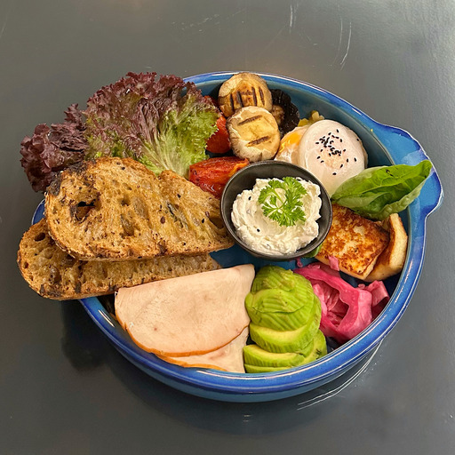 آواکادو، سينه بوقلمون دودي، پنيرهالومي، قارچ، پوچد اگ، گوجه، کاهو، نان و پنير