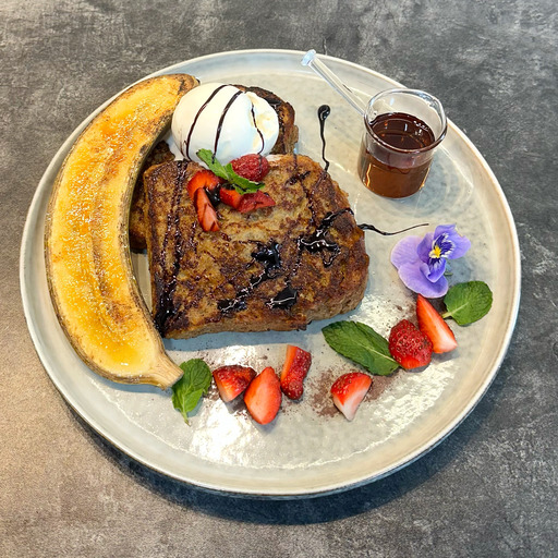 نان بريوش، سس کارامل، موز کاراملايز، يک اسکوپ بستني، توت فرنگي